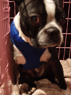 My new foster mom is a freak. First, she makes me wear this bright blue harness. THEN, she puts me in a bright PINK kennel (yes, I have a penis). I am like color blind and I can see better than she can! Next she gives me a stuffed animal to play with- so I bite the head off and gut the insides out of it to send her a message. Do I freakin' LOOK happy?